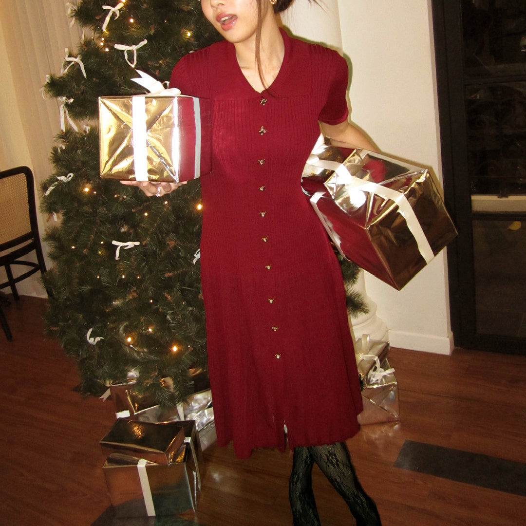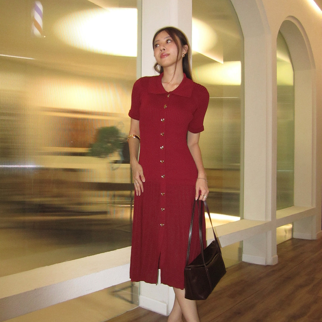 Gaun rajut klasik berwarna krem lembut dengan kerah tradisional dan potongan fit-and-flare yang anggun. Keunikan utamanya terletak pada detail kancing berbentuk bunga berwarna emas yang elegan, memberikan sentuhan manis dan berbeda pada desain yang minimalis. Bagian bawah gaun dihiasi motif menyerupai renda yang menambah kesan feminin. Cocok untuk tampilan sehari-hari yang rapi atau acara santai yang elegan.