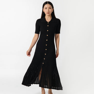 Gaun rajut klasik berwarna krem lembut dengan kerah tradisional dan potongan fit-and-flare yang anggun. Keunikan utamanya terletak pada detail kancing berbentuk bunga berwarna emas yang elegan, memberikan sentuhan manis dan berbeda pada desain yang minimalis. Bagian bawah gaun dihiasi motif menyerupai renda yang menambah kesan feminin. Cocok untuk tampilan sehari-hari yang rapi atau acara santai yang elegan.