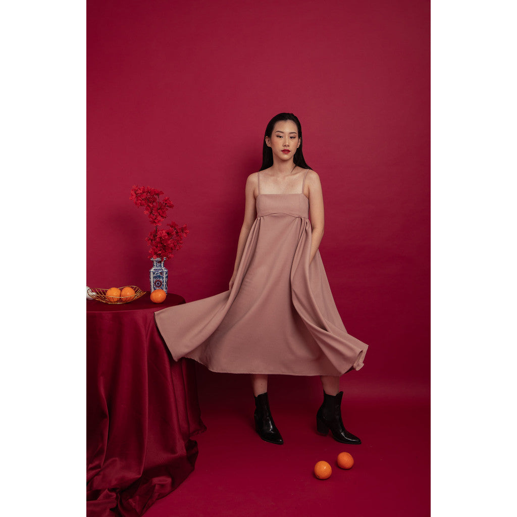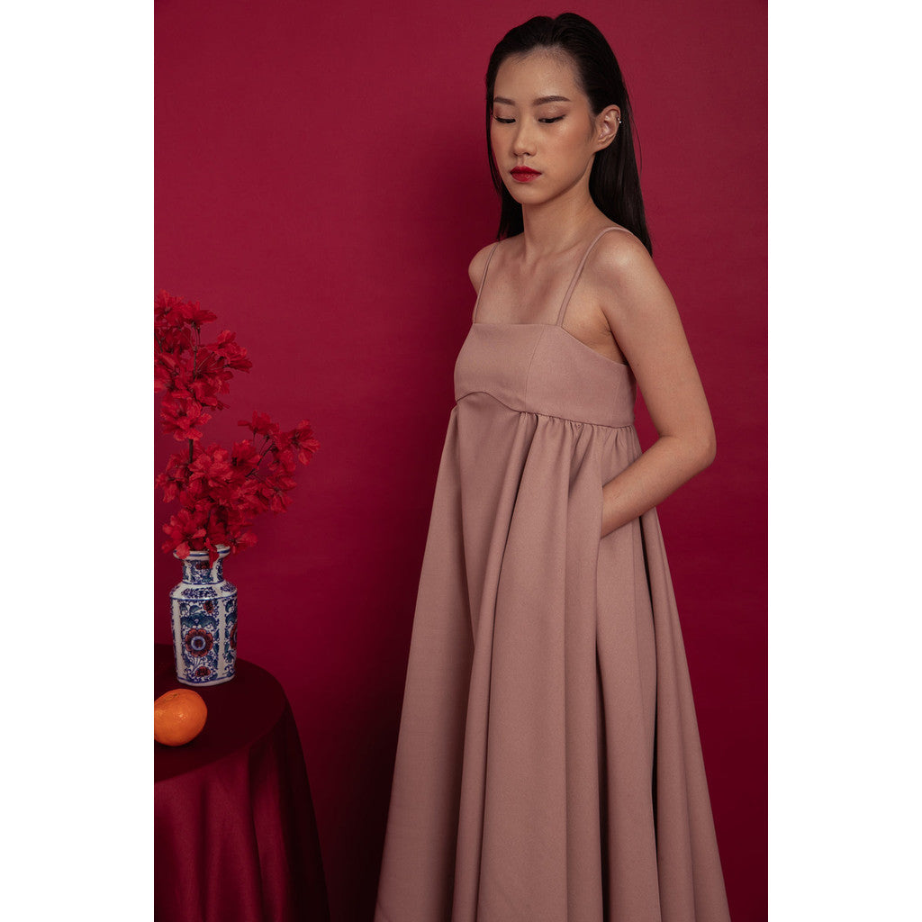 Empire cut midi dress with gathered details on the waist and side pockets