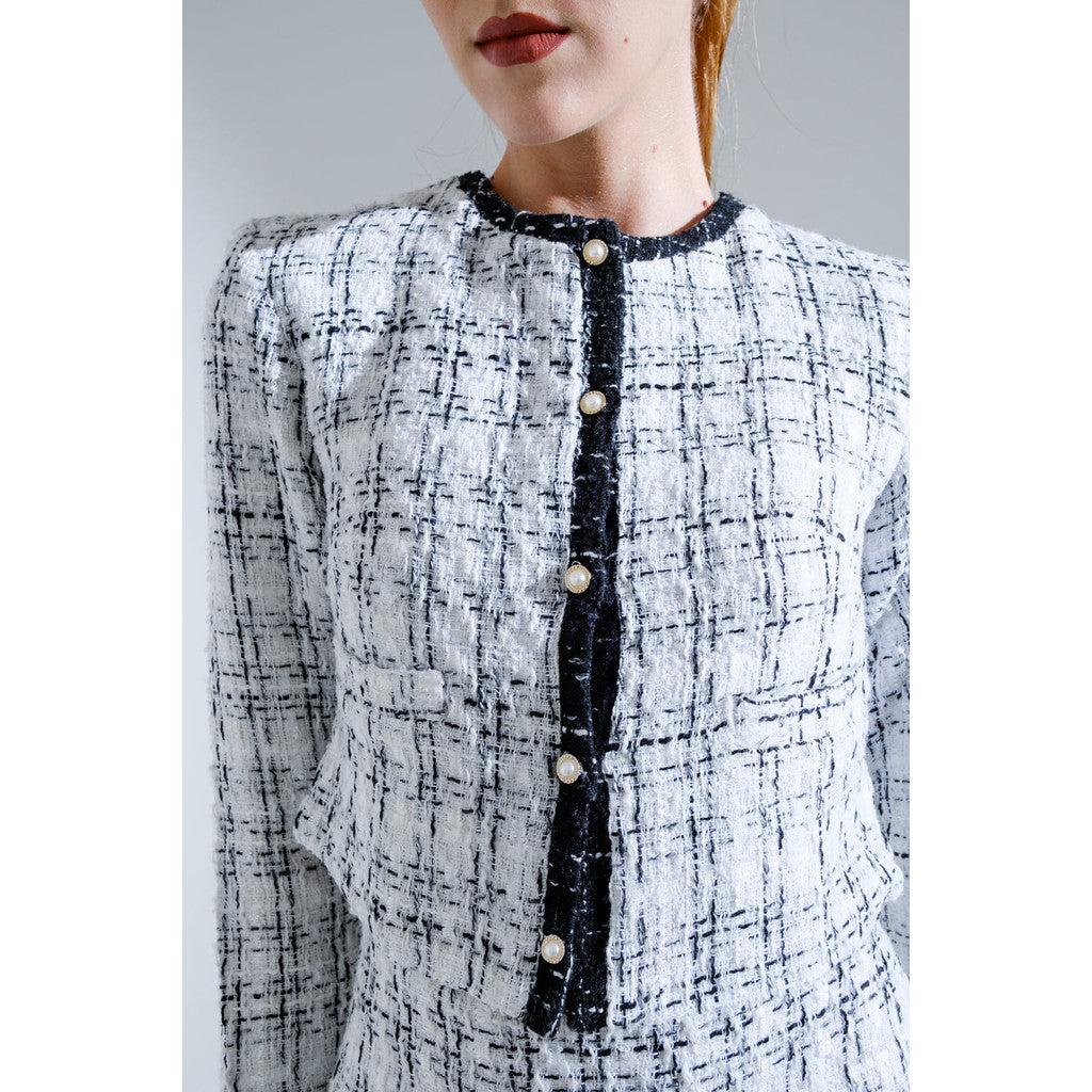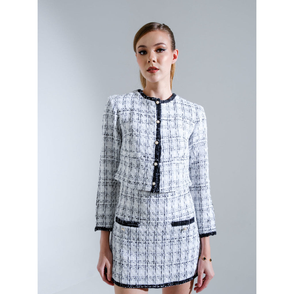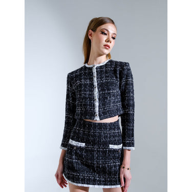 Breathes new life into Was Taken, respecting the house’s with modern relevance. This tweed jacket dons a classic, collarless style, while referencing the Was Taken’s forward-looking design approach influences styles, cut from tweed to a cropped silhouette. The model features a round neckline, paneled detail and embellished buttons.