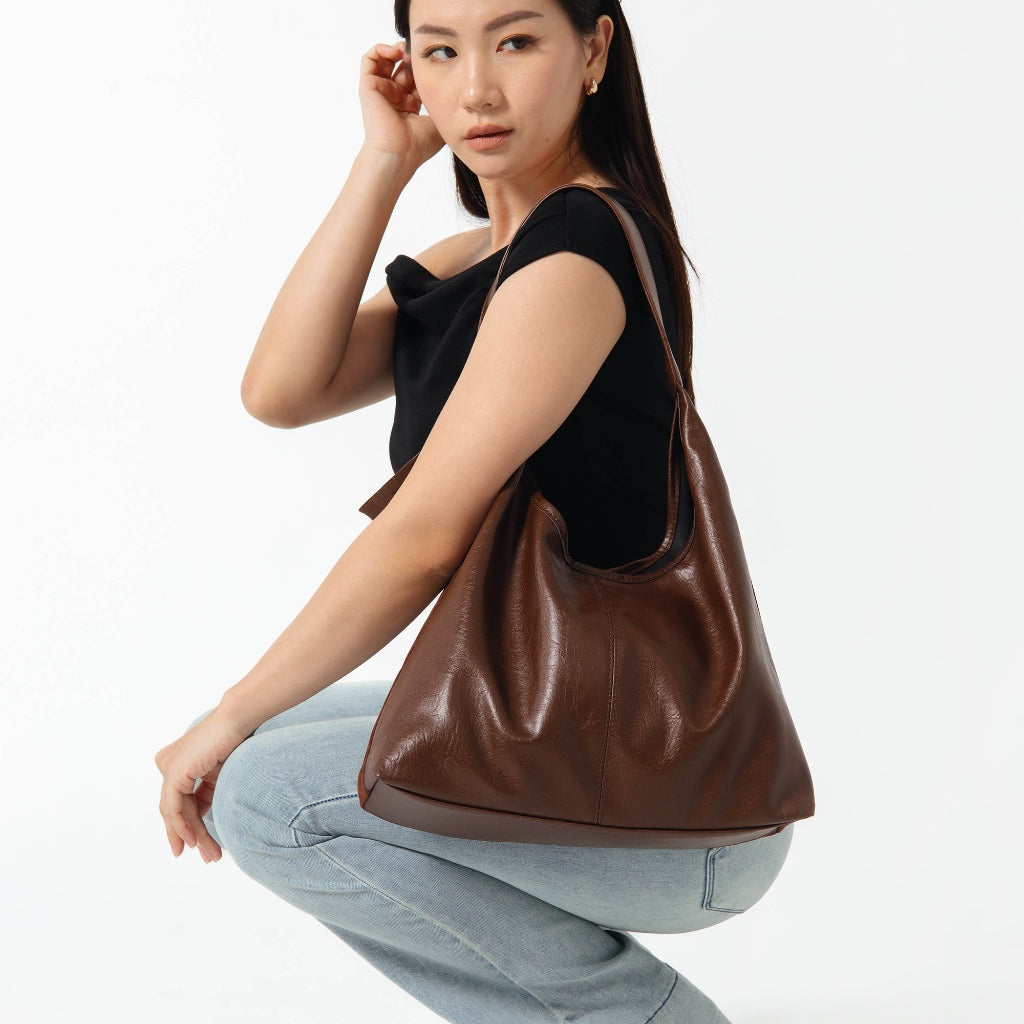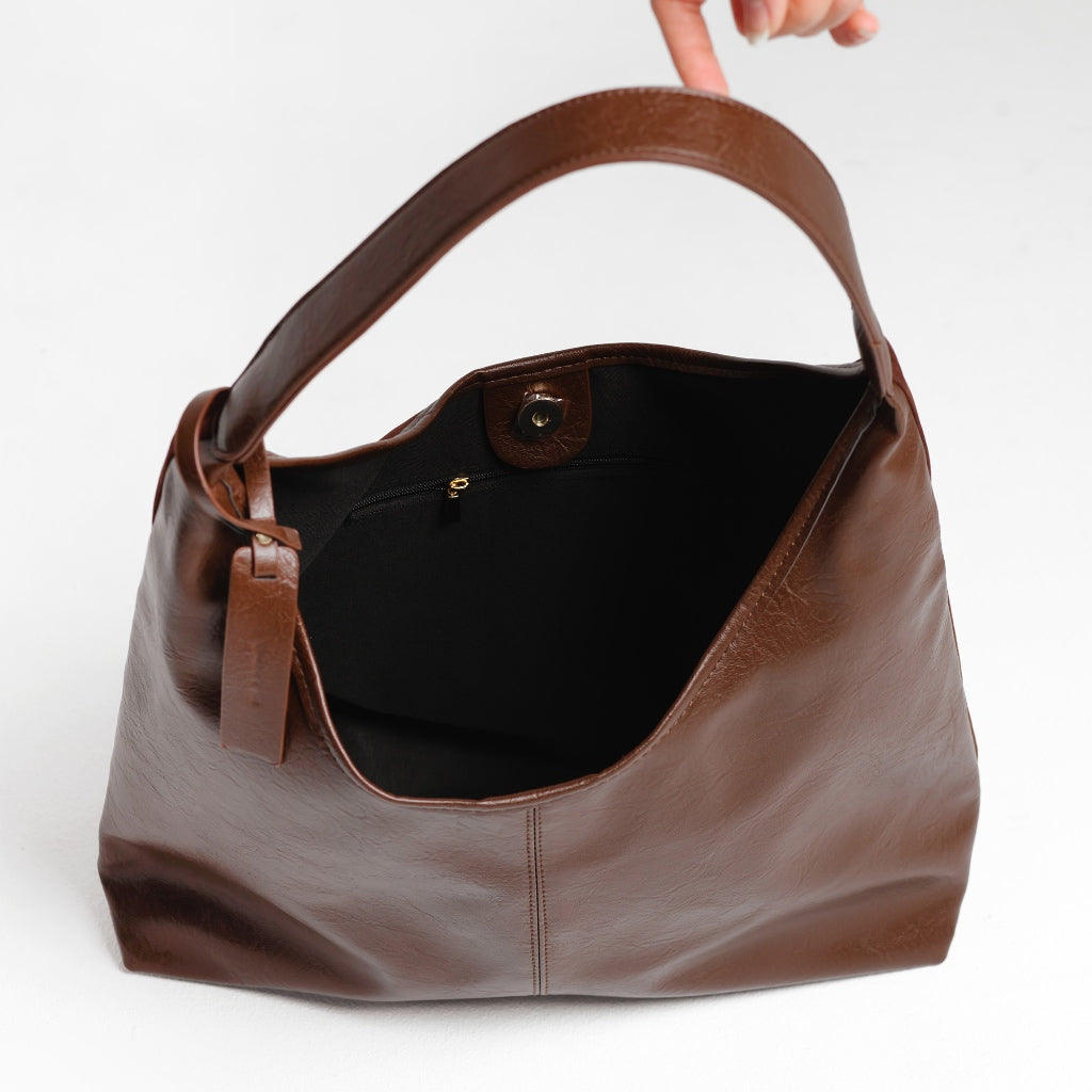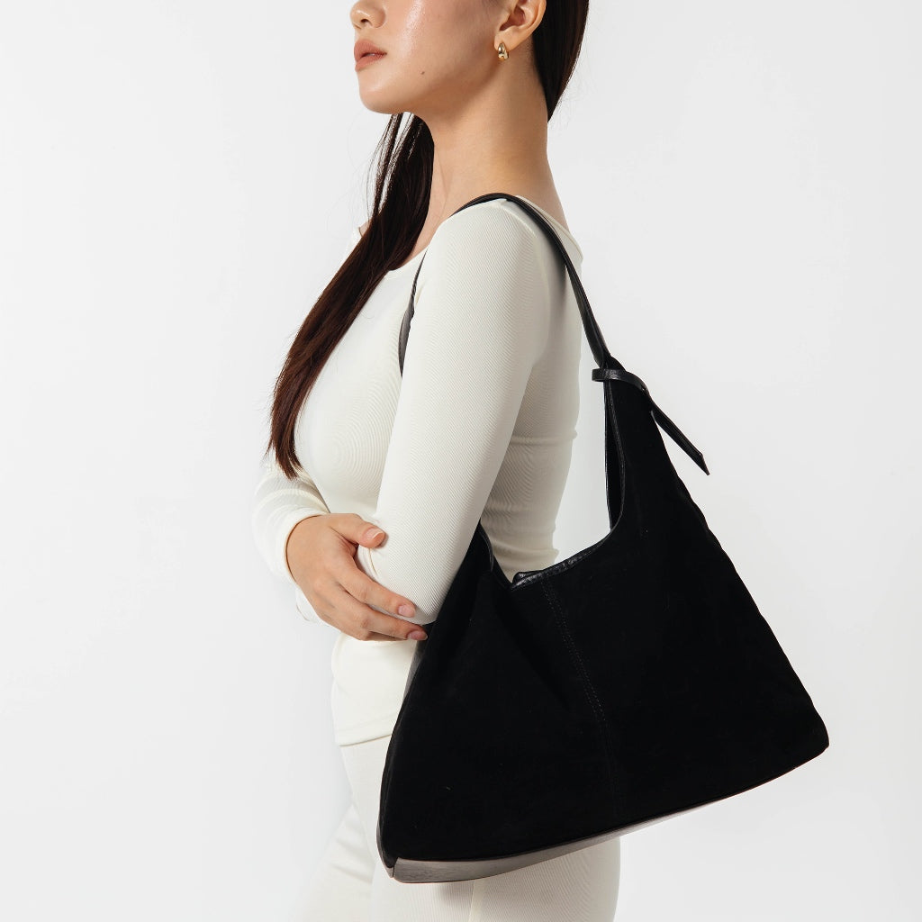 Tas reversible dengan dua tampilan: suede sintetis yang lembut di satu sisi, kulit PU yang elegan di sisi lainnya. Ringan, luas, dan nyaman digunakan sehari-hari—teman setia untuk gaya yang fleksibel dan effortless.